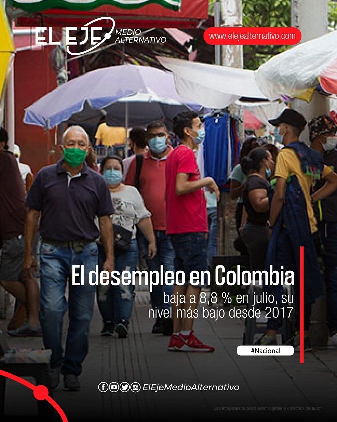 La tasa de desempleo en Colombia se situó en 8,8 % en julio pasado, lo que representa el nivel más bajo del mercado laboral desde el 2017, informó este viernes el Departamento Administrativo Nacional de Estadística (DANE).
